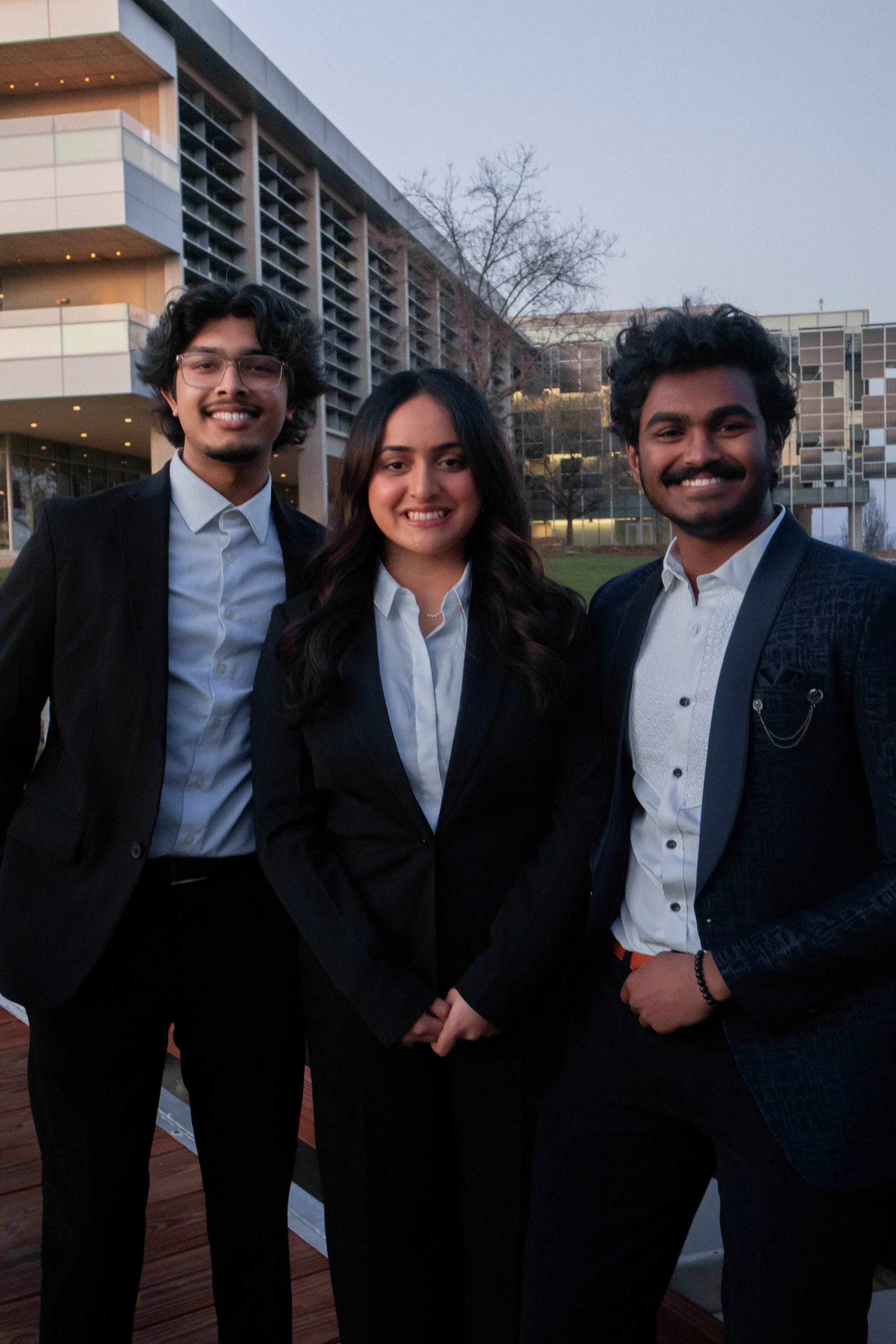 Three people in formal attire smiling in front of modern buildings at dusk.
